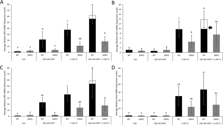 Fig. 2. GRKO tadpoles exhibit lack of CORT/TH synergy for thrb expression in the tail. WT and GRKO tadpoles at NF 54 were treated for 24 h with vehicle, 100 nM CORT, 2 nM T3, and 100 nM CORT plus 2 nM T3, and then gene expression was examined for (A) klf9 in tail, (B) thrb in tail, (C) klf9 in liver, and (D) thrb in liver. White portions of treatment bars for hormone co-treatments significantly higher than in T3 alone represent expression above additive response estimated from T3 and CORT responses singly. Black arrow indicates a synergistic response, defined as greater than one standard deviation above the estimated additive portion of the response. Error bars represent standard deviation (SD). Letters represent significance groups among all treatments within each panel. n = 12, WT = wild-type, GRKO = glucocorticoid receptor knockout, Veh = vehicle (ethanol treatment), CORT = corticosterone, T3 = active form of TH. |