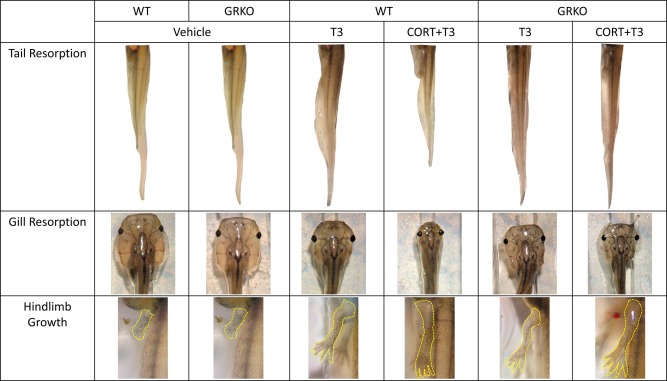 Fig. 4. Exemplar images of WT and GRKO tadpoles treated with or without T3 and/or CORT. Representative images of WT and GRKO tadpoles treated for 6 days with vehicle, 2 nM T3, and 100 nM CORT plus 2 nM T3 are shown. Note the stronger effect of T3 + CORT compared to T3 alone in tail and gill in wild-type (WT) and not GRKO tadpoles. n = 5, Veh = vehicle (ethanol treatment), T3 = active form of TH. |