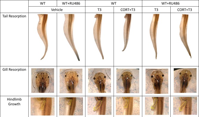 Fig. 6. Exemplar images of WT and RU486-treated tadpoles treated with or without T3 and/or CORT. Representative images of WT and RU486-treated tadpoles treated for 6 days with vehicle, 2 nM T3, and 100 nM CORT plus 2 nM T3 are shown. Note the stronger effect of T3 + CORT compared to T3 alone in tail and gill in wild-type (WT) and not RU486-treated tadpoles. n = 5, Veh = vehicle (ethanol treatment), RU486 = GR antagonist, T3 = active form of TH. |
