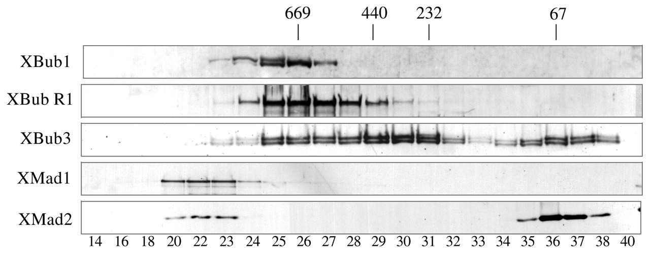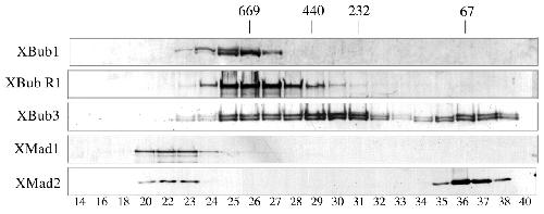 Gel filtation analysis of XBub3 protein complexes in egg extracts. A CSF egg extract was fractionated by Superose-6 gel filtration chromatography (see Materials and Methods). Protein-containing fractions were analysed by western blotting with antibodies to XBub1, XBubR1, XBub3, XMad1 and XMad2 proteins. No protein was detected by Ponceau staining or western blotting prior to fraction 14 and after fraction 40. The elution positions of molecular weight standards are indicated.