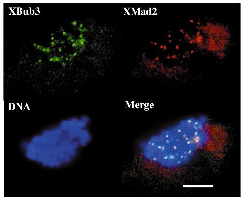Colocalisation of XBub3 and XMad2 at kinetochores in nocodazole-treated XTC cells. XTC cells grown on coverslips were treated with 10 μg/ml nocodazole for 4 hours and then fixed and stained using rabbit XMad2 antibody (XMad2) and a sheep XBub3 peptide antibody (XBub3). The antibodies were detected using fluorescence-labelled secondary antibodies (XBub3 is green, XMad2 is red). Chromosomes were detected by mounting the coverslips in medium containing DAPI (DNA). The merge of all three fluorescent images is also shown. Bar, 10μ m