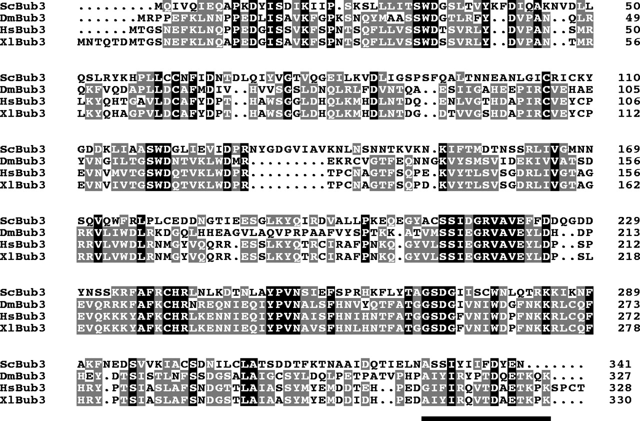 Alignment of Bub3 homologues. A Clustal alignment of Bub3 proteins from Saccharomyces cerevisiae (M64707), Drosophila melanogaster (AF106679), Homo sapiens (AF047473) and Xenopus laevis (AB018419/AF119790). Identical residues are shown in black and similar residues are highlighted in grey. The region against which the peptide antibodies were raised is underlined.