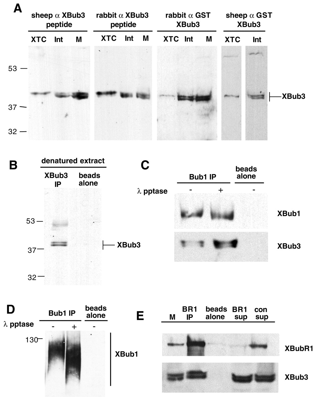 Detection of XBub3 by immunoblotting and its co-immunoprecipitation with XBub1/XBubR1. (A) Immunoblot analysis of XBub3 in XTC cell lysates (XTC), interphase egg extracts (Int) or CSF egg extracts (M), using sheep and rabbit XBub3 peptide and full-length XBub3 antibodies. A doublet of bands in egg extracts and a single band in XTC cell lysates were specifically detected. (B) Immunoblot analysis of proteins immunoprecipitated from a denatured (TCA precipitated and re-natured) CSF egg extract using XBub3 antibody beads (XBub3 IP) or control beads without antibody. Both bands of the XBub3 were immunoprecipitated, although neither can be efficiently immunoprecipitated from a native extract (data not shown). (C) XBub1 and XBub3 co-immunoprecipitate. CSF egg extracts were incubated with beads alone or XBub1 beads and the immunoprecipitates were then treated with (+) or without (-) λ protein phosphatase (λ pptase). Bound proteins were eluted in sample buffer, separated by SDS-PAGE and the Bub proteins were then detected by immunoblotting using rabbit anti-XBub1 antibody or sheep anti-XBub3 peptide antibody. (D) As in C, except that the XBub1 was further resolved by running a large 7.5% SDS polyacrylamide gel for 12 hours. (E) XBubR1 and XBub3 co-immunoprecipitate. CSF egg extracts (M) were immunoprecipitated with BUBR1 antibodies (BR1 IP) or beads alone. Samples of BubR1-depleted supernatant (BR1 sup) or beads alone supernatant (con sup) are shown. Bub proteins were detected by immunoblotting using rabbit anti-XBubR1 antibody or sheep anti-XBub3 peptide antibody.
