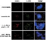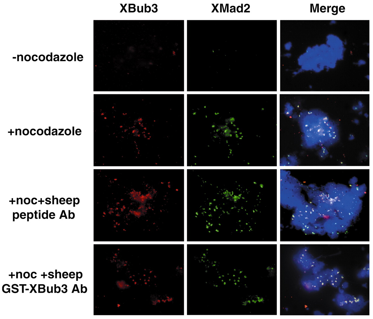 Effect of XBub3 antibodies on XBub3 and XMad2 localisation in egg extracts. Metaphase chromosomes were assembled in egg extracts and treated with (+noc) or without (-noc) nocodazole. Sheep peptide or full-length XBub3 antibodies were added to the extracts 90 minutes before nocodazole addition. Chromosomes were isolated through a 30% glycerol cushion onto coverslips and stained with a sheep peptide XBub3 antibody followed by a fluorescent anti-sheep antibody (-noc, +noc) or fluorescent anti-sheep antibody alone (+noc +sheep XBub3 peptide Ab, +noc +sheep GST XBub3 Ab) to detect the sheep antibodies pre-incubated in the egg extract. Co-staining with XMad2 was achieved by incubating the coverslips with the rabbit XMad2 antibody. Chromosomes were detected by mounting the coverslips in medium containing DAPI (DNA).