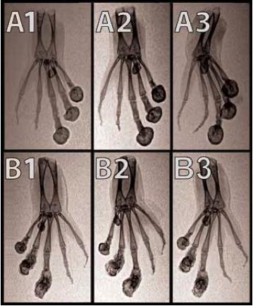 Figure 2. Dorsoventral (A1), ventrodorsal (A2), and ventrodorsal oblique (A3) inverted-grayscale radiographs of the left hind foot. Dor- soventral (B1), ventrodorsal oblique (B2), ventrodorsal (B3) inverted- grayscale radiographs of the right hind foot of an affected X. tropicalis. Smoothly margined, rounded peripherally mineralized lesions are pre- sent on the distal aspects of digits 0, I, II, and III. Note the malangulation of P4 and P3 on digit IV. Note the malangulation of P3 and P2 on digit V.
