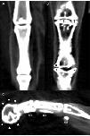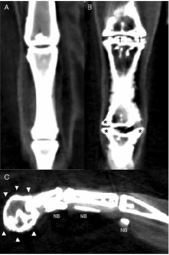 Figure 3. Reconstructed dorsal plane CT image of a normal MTP and IP joint (A), reconstructed dorsal plane CT image of a severely affected MTPjoint and IP joint (B) with periarticular new bone formation (as- terisks *) and new bone formation within the joint space (daggers â ), and reconstructed sagittal plane CT image of a severely affected digit (C) with a misshaped distal phalanx surrounded by a rim of new bone (arrowheads â²) and linear mineralization plantar to the digit within the extensor tendons (NB).