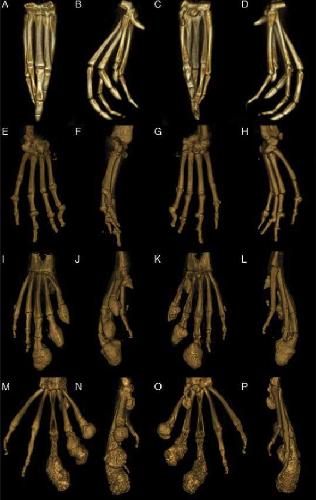 Figure 4. Reconstructed 3D volume renderings of a normal pes (A-D), a severely affected manus (E-H), a severely affected pes (I-L), and the most severely affected pes (M-P). A, E, I and M are dorsal views; B, F, J, and N are medial views, C, G, K, and O are palmar/plantar views, and D, H, L, and P are lateral views. A-D: Normal pes. E-H: Severely affected manus with severe periarticular and articular new bone formation in multi- ple MCP and IP joints with malangulation and subluxation of the IP joint. I-L: Severely affected pes that has rounded peripherally mineralized lesions on digits 0-III which extend proximal to the IP. There is severe linear mineralization plantar to digits I-IV in the flexor tendons. Similar to the manus, there is periarticular and articular new bone formation in the MTP and IP joints in the nonclawed digits and of the clawed digits proximal to the rounded lesions. M-P: Most severely affected pes with rounded peripherally mineralized lesions extending to the proximal phalanx, linear mineralization plantar to digits I-III, and severe periarticular new bone formation.