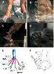 Figure 1. The gross figures of the feet of affected frogs. Four X. tropicalis displaying nodules on the distal aspects of the digits of the hindlimbs (A-D). The bone anatomy of a normal hindlimb (E). The normal X. tropicalis hind foot is characterized by: digit 0 shown in black, metatarsals in pink, tibiae in sky blue, fibulae in blue, first phalanx (P1) in green, second phalanx (P2) in purple, third phalanx (P3) in yellow, fourth phalanx (P4) in royal blue (on digit IV). Claws are only present on digits 0, I, II, and III. Note the normal, triangular-shaped distal phalanx. Hind foot dia- gram demonstrating which digits are the most affected (F). Seven frogs submitted directed to Stanford Necropsy Laboratory displayed nodules on the distal end of digits 0, I, II, III of the hindlimbs. None of the frogs displayed nodules on digits IV or V.