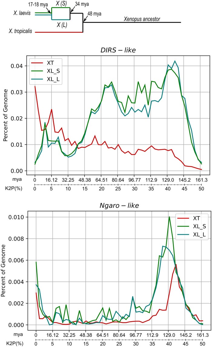 Figure 3. Evolution of Xenopus species and evolutionary dynamics of DIRS elements. The evolutionary events as estimated by Session et al. (2016) are shown: the speciation of X. tropicalis and the ancestor of X. laevis at 48 mya, the speciation of the L and S progenitors of X. laevis at 34 mya, and their hybridization around 17–18 mya. The graphs show the divergence of DIRS-like (above) and Ngaro-like (below) copies mapped in the genomes of X. tropicalis and X. laevis (S and L subgenomes) with their consensus sequence expressed in Kimura-2-parameters distance and the corresponding time of divergence in million years (x-axis) plotted in relation to the proportion in the genome (y-axis).