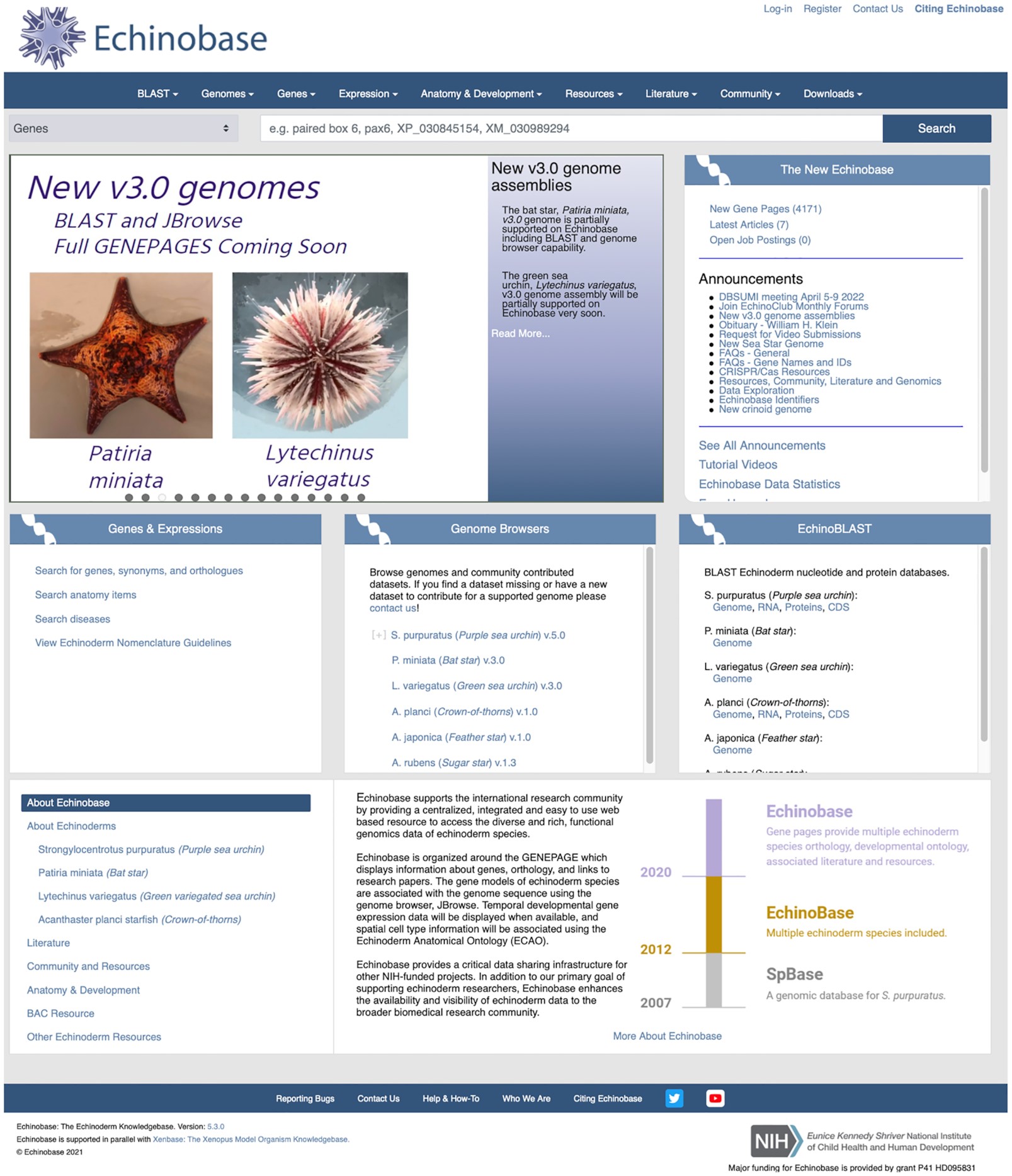 Figure 1. The Echinobase landing page and portal. A central feature of the page is an animated ‘news slider’ that presents a slide show of community news and new features of the resource. A horizontal navigation menu shared between all Echinobase pages provides consistency, and large ‘tiles’ of grouped content, e.g. ‘Genes and Expression’, ‘Genome Browsers’ and ‘BLAST’ aggregate commonly used tools and content.