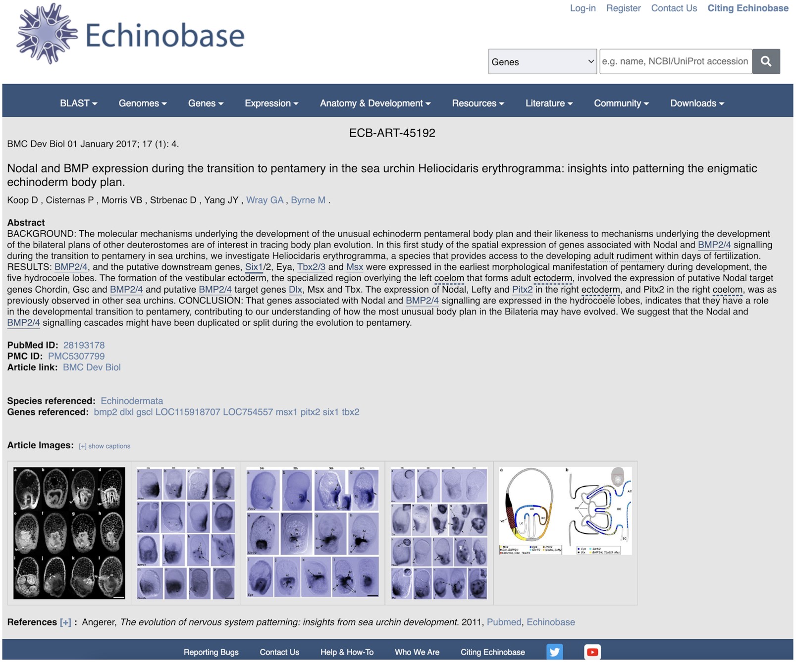 Figure 3. Echinobase literature pages. This screenshot illustrates a paper that has been processed by automated systems only, so all links, identified genes, authors and anatomy terms, figures and legends etc. were added by machine-based methods. The only organism detected by these tools was ‘echinodermata’, and a curator must annotate this page to include the species in the title, Heliocidaris erythrogramma, add additional genes, experimental reagents (morpholinos etc.), curate the gene expression patterns in the figures etc. When this is done all these data will also be displayed on this page. Authors with Echinobase community pages are hyperlinked, as are terms in the abstract and figure legends matching genes/synonyms, anatomy/synonyms etc. When text matches more than one target, selecting the link will display a disambiguation page.