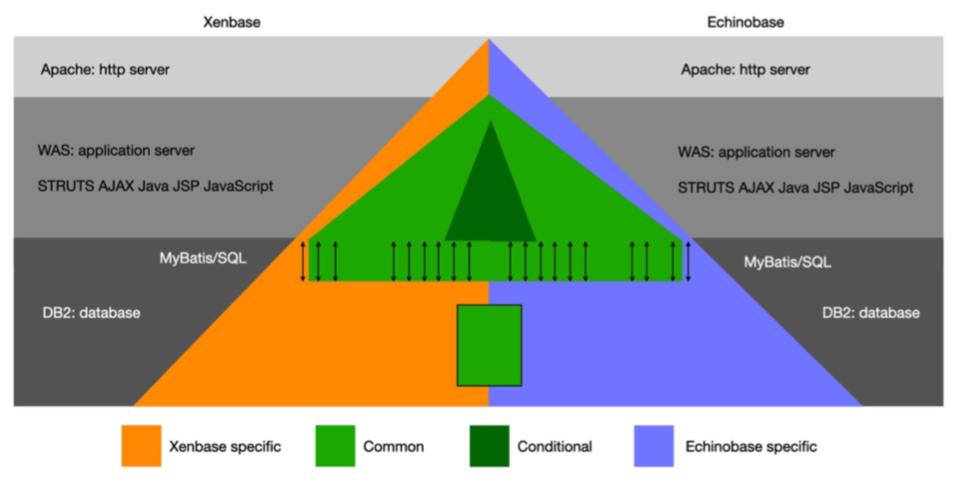 Supplemental Figure 1. The Xenbase and Echinobase software stacks. The majority of code is shared between the two resources and features developed for one site benefit the other (light green). When features are resource specific, conditional code is utilized as indicated by dark green. Database content is mostly unique to each resource, except for shared content such as core ontologies (e.g. GO), disease relationships, human protein-protein interaction data etc. Double ended arrows indicate database queries.
