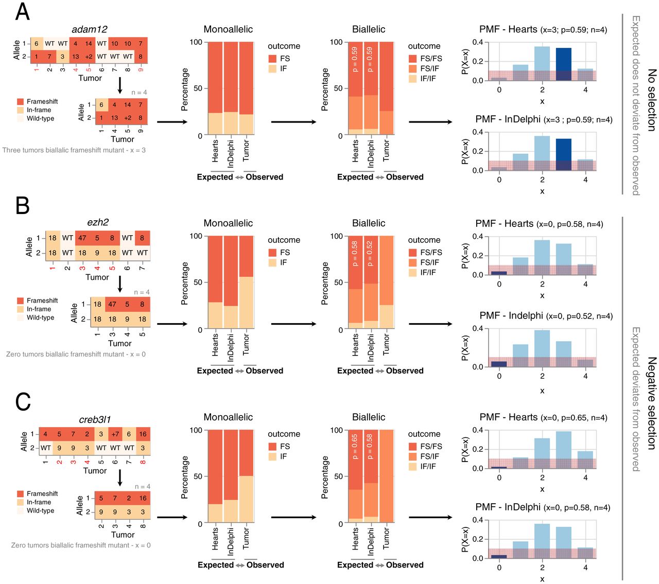 Fig. 3. Statistical probability of ezh2 or creb3l1 biallelic frameshift mutations in desmoid tumors in relation to deep-learning predictions of gene editing outcomes. (A) Lack of selection mechanisms toward specific adam12 gene editing outcomes during desmoid tumorigenesis. The CRISPR/Cas9 editing outcomes for adam12 in desmoid tumors containing biallelic mutations (in-frame + frameshift) are likely and do not deviate from what is predicted by InDelphi and experimentally sampled in heart tissue. Given the adam12 editing outcomes sampled in hearts (i.e., in absence of selective pressure), the probability of a single biallelic mutant desmoid tumor to have biallelic frameshift editing outcomes is 59%. The probability of sampling 60% (3/5 tumors) with biallelic frameshift adam12 allelic status is likely (probability is 35%). Similarly, using InDelphi predictions, the probability of sampling this proportion of desmoid tumors with adam12 biallelic frameshift mutations is likely given binomial theory (probability is 34%). Red demarcation represents a 10% probability interval. PMF, probability mass function. (B and C) Editing outcomes for ezh2 and creb3l1 remain similar between InDelphi predictions and experimental observations in the heart of X. tropicalis. Significant deviations from the two former values are seen in the gene editing outcomes occurring in desmoid tumors. In line, the probabilities of never sampling biallelic frameshift mutations in ezh2 and creb3l1 within desmoid tumors is binomially unlikely (probability is 5% or smaller) given the editing outcomes in absence of tumor selection (heart tissue and InDelphi). |