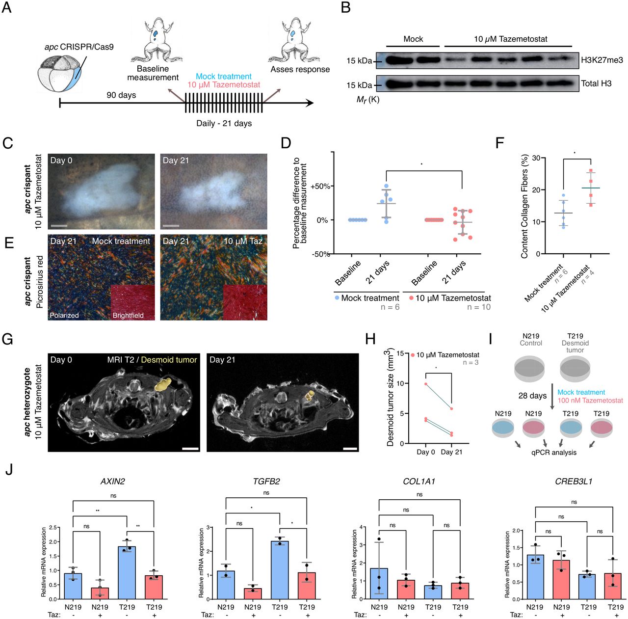 Fig. 5. Ezh2 inhibition via Tazemetostat elicits a therapeutic response in desmoid tumors. (A and B) Tazemetostat-treated F0 apc crispants show a reduction in H3K27me3 levels in the liver (unaltered original scans of blots SI Appendix, Fig. S7). (C and D) Quantitatively, desmoid tumor size reveals stable or progressive disease in the control arm, while in Tazemetostat-exposed animals regression or stasis of tumors could be observed. Each data point represents one desmoid tumor; note that some animals developed multiple tumors (two-way ANOVA with repeated measurements; Dataset S6D; *P < 0.05). (E and F) Picrosirius Red staining with polarized light detection. The degree of alignment of collagen fibers is significantly increased in Tazemetostat-treated tumors when compared with mock-treated tumors (Studentâs t test; Dataset S6D; *P < 0.05). (G and H) Desmoid tumors in apcMCR-Î1/+ heterozygotes respond treatment with Tazemetostat (paired Studentâs t test; Dataset S6D; *P < 0.05). (I) Treatment scheme of primary human desmoid tumor culture (T219) and paired normal cells derived from the fascia (N219) with Tazemetostat (100 nM) for 4 wk. (J) qRT-PCR analysis of AXIN2, TGFB2, COL1A1, and CREB3L1 expression in DMSO- (blue bars) or Tazemetostat (red bars)-treated cells (one-way ANOVA; Dataset S6D; *P < 0.05 **P < 0.01) (Gray scale bar, 1 mm; white scale bar, 3 mm). |