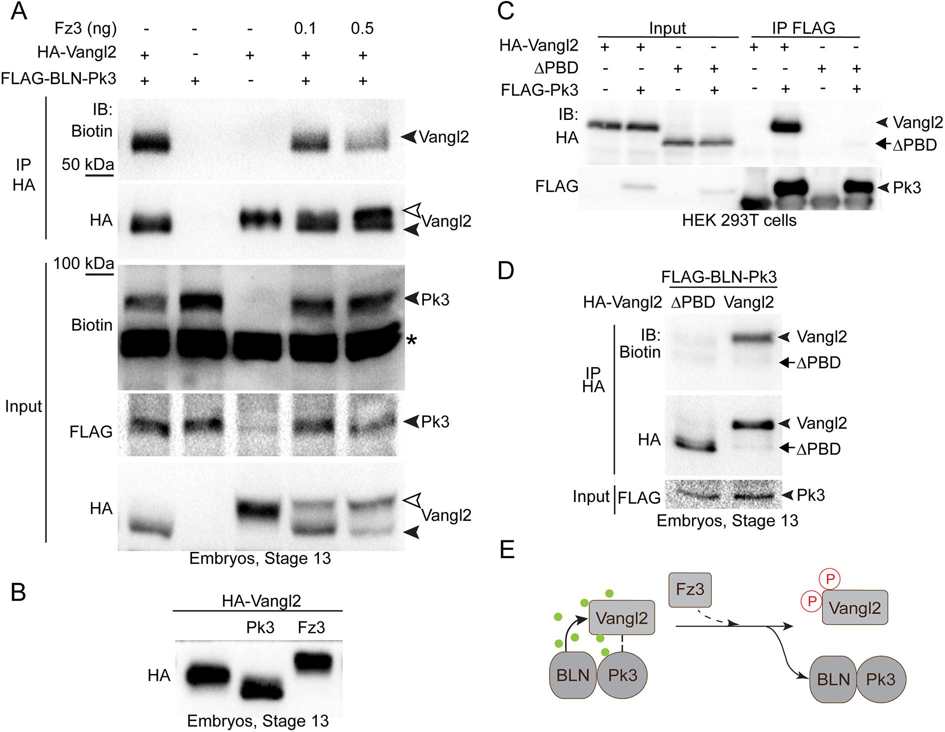 The orientation of epithelial cells in the plane of the tissue, known as planar cell polarity (PCP), is regulated by interactions of asymmetrically localized PCP protein complexes. In the Xenopus neural plate, Van Gogh-like2 (Vangl2) and Prickle3 (Pk3) proteins form a complex at the anterior cell boundaries, but how this complex is regulated in vivo remains largely unknown. Here, we use proximity biotinylation and crosslinking approaches to show that Vangl2-Pk3 association is inhibited by Frizzled3 (Fz3, also known as Fzd3), a core PCP protein that is specifically expressed in the neuroectoderm and is essential for the establishment of PCP in this tissue. This inhibition required Fz3-dependent Vangl2 phosphorylaton. Consistent with our observations, the complex of Pk3 with nonphosphorylatable Vangl2 did not polarize in the neural plate. These findings provide evidence for in vivo regulation of Vangl2-Pk3 complex formation and localization by a Frizzled receptor.
