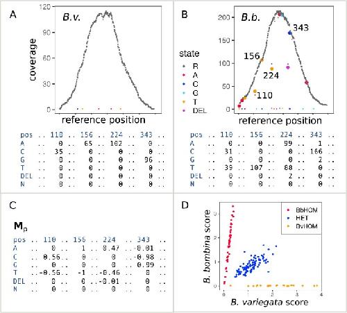 Figure 2. Polarization of the raw read coverage. The top two plots show the raw read coverage along the reference sequence of locus 332172 for F0 B. variegata (A) and F0 B. bombina (B). The B. variegata individual is homozygous for the reference state (R) at all sequence positions, whereas the B. bombina individual has a number of variants. Two homozygous (156 and 343) and two heterozygous (110 and 224) variant positions are highlighted. For these four, the matrix entries are listed below the plots. A polarized matrix, Mp, is computed from these read counts (see text, C), in which sequence states associated with B. variegata have positive entries and sequence states associated with B. bombina have negative entries. For each sample, raw read counts are then multiplied by Mp. Average positive entries and average negative entries result in a B. bombina score and a B. variegata score, respectively, and when plotted in a coordinate system (D), samples can be assigned to three clusters representing BbHOM, HET, and BvHOM. Note that the heterozygous variants (B) do not interfere with the clustering into three diplotypes. |
