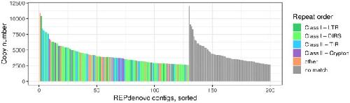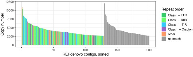 Figure 3. The distribution of repeat types. We show the 200 REPdenovo contigs with the highest copy number. Transposable element orders represented by more than 10 contigs in this set are identified by color. The classification follows Wicker et al. (2007). Contigs without a match in Repbase (blastn and tblastx) are labeled as “no match” and ordered separately. LTR, long terminal repeat retrotransposon; DIRS, Dictyostelium intermediate repeat sequence; TIR, terminal inverted repeat DNA transposon. |