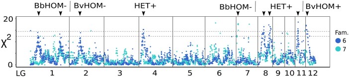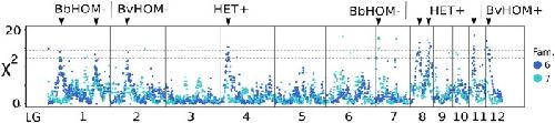Figure 5. Segregation distortion, Ï2, by family and linkage map position. Dashed horizontal lines are significance thresholds: the lower line is the Bonferroni correction based on the number of chromosome arms, and the upper line is the critical value for the Benjamini and Hochberg false discovery rate (the experiment-wise α is 0.05 for both). For each significant spike, which is indicated with an arrowhead, the genotype showing the strongest deviation is noted along with a (+) or (â) label, where (+) = excess and (â) = deficit. Groups of spikes with the same deviation are separated by vertical lines above the plot. For clarity, 22 observations from 20 loci with Ï2 > 20 are excluded from the plot. |