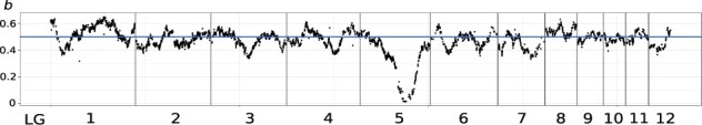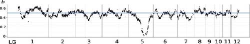 Figure 7. Estimated frequency of two sex-diplotype combinations among homozygous F2 individuals, b. See text for the definition of b. The global minimum on LG5 indicates the sex-determining region. The blue line represents the null hypothesis of b = 0.5. |