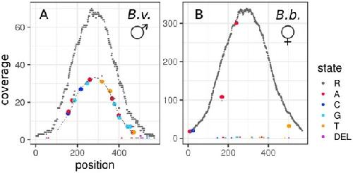 Figure 8. Raw read coverage at locus 5568 in the F0 generation. Plots follow the format of Figure 2: raw read coverage (y-axis) is shown for each reference position (x-axis) and sequence state (R = reference state) for F0 B. variegata (A) and F0 B. bombina (B). Nonreference states are highlighted in color. Variants in the sex-linked haplotype (A) are connected with a dashed line. |