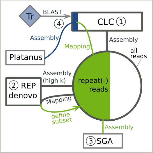 Figure 1. Overview of B. variegata genome assemblies. The large circle represents the total read set. Assemblies are numbered 1–4. hi K, highly over-represented kmers (at least 100x average frequency); Tr, B. v. variegata transcriptome; repeat(−) reads, repeat-subtracted portion of the total read set. CLC contigs with a BLAST+ hit (query: transcriptome) are represented by a blue rectangle. |