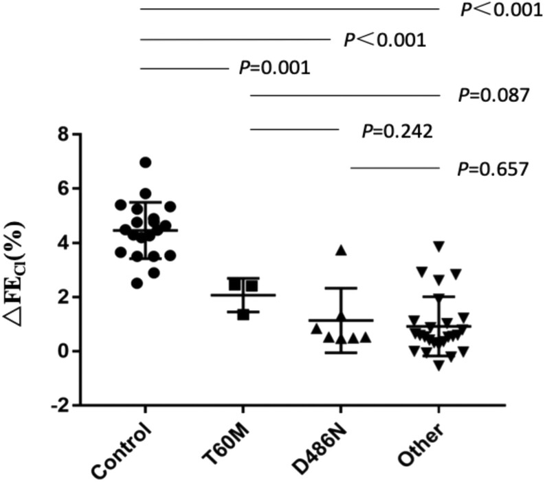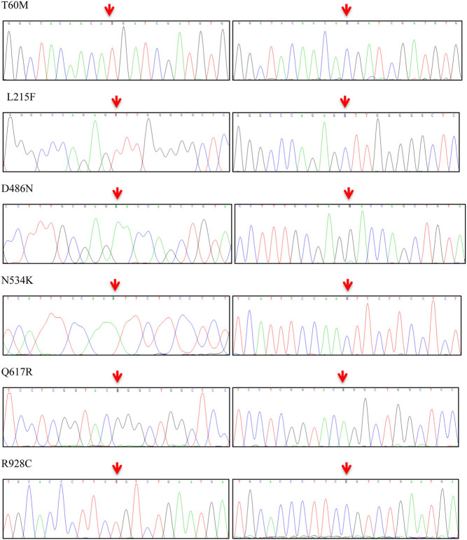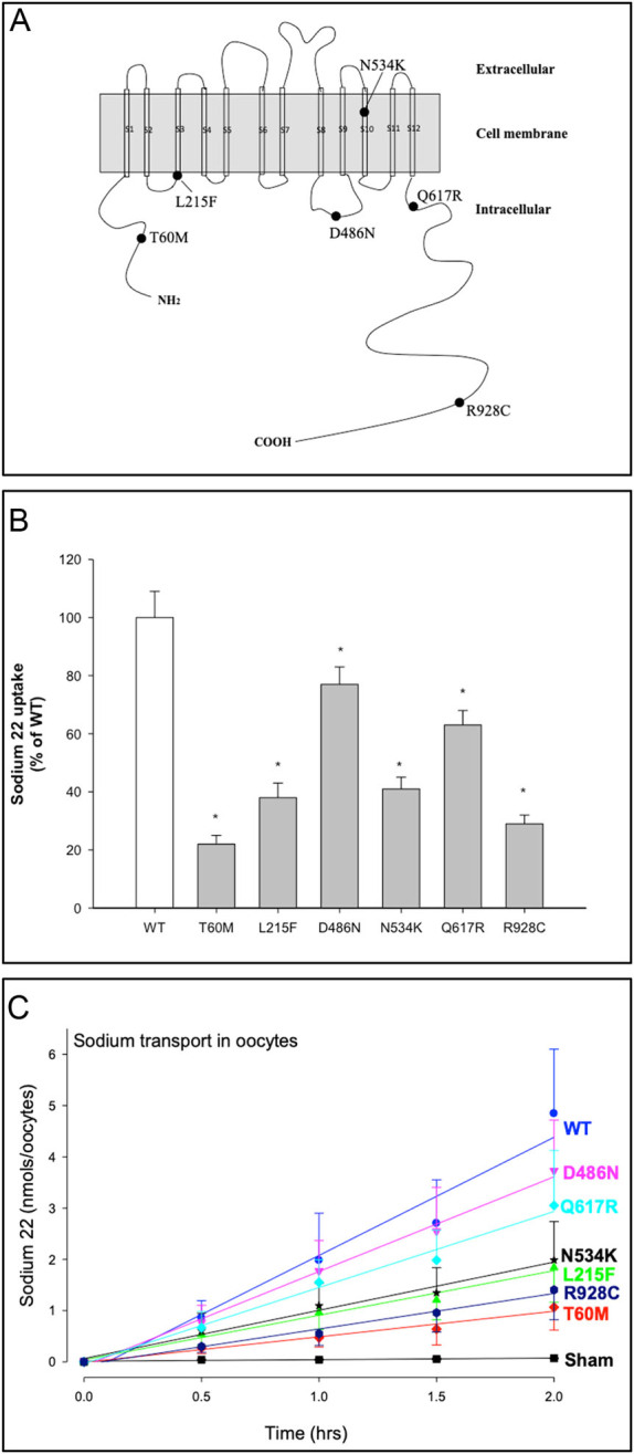 Purposes: This study was conducted to identify the frequent mutations from reported Chinese Gitelman syndrome (GS) patients, to predict the three-dimensional structure change of human Na-Cl co-transporter (hNCC), and to test the activity of these mutations and some novel mutations in vitro and in vivo. Methods: SLC12A3 gene mutations in Chinese GS patients previously reported in the PubMed, China National Knowledge Infrastructure, and Wanfang database were summarized. Predicted configurations of wild type (WT) and mutant proteins were achieved using the I-TASSER workplace. Six missense mutations (T60M, L215F, D486N, N534K, Q617R, and R928C) were generated by site-directed mutagenesis. 22Na+ uptake experiment was carried out in the Xenopus laevisoocyte expression system. In the study, 35 GS patients and 20 healthy volunteers underwent the thiazide test. Results: T60M, T163M, D486N, R913Q, R928C, and R959frameshift were frequent SLC12A3 gene mutations (mutated frequency >3%) in 310 Chinese GS families. The protein's three-dimensional structure was predicted to be altered in all mutations. Compared with WT hNCC, the thiazide-sensitive 22Na+ uptake was significantly diminished for all six mutations: T60M 22 ± 9.2%, R928C 29 ± 12%, L215F 38 ± 14%, N534K 41 ± 15.5%, Q617R 63 ± 22.1%, and D486N 77 ± 20.4%. In thiazide test, the net increase in chloride fractional excretion in 20 healthy controls was significantly higher than GS patients with or without T60M or D486N mutations. Conclusions: Frequent mutations (T60M, D486N, and R928C) and novel mutations (L215F, N534K, and Q617R) lead to protein structure alternation and protein dysfunction verified by 22Na+ uptake experiment in vitro and thiazide test on the patients.
