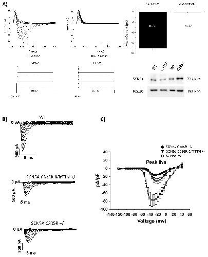CONCLUSION: The SCN5a p.C335R variant is causing a loss of function of peak INa in patients with DCM and cardiac conduction disease. The co-existence of genetic variants in channels and structural genes (e.g., SCN5a p.C335R and TTNtv) increases the severity of the DCM phenotype.