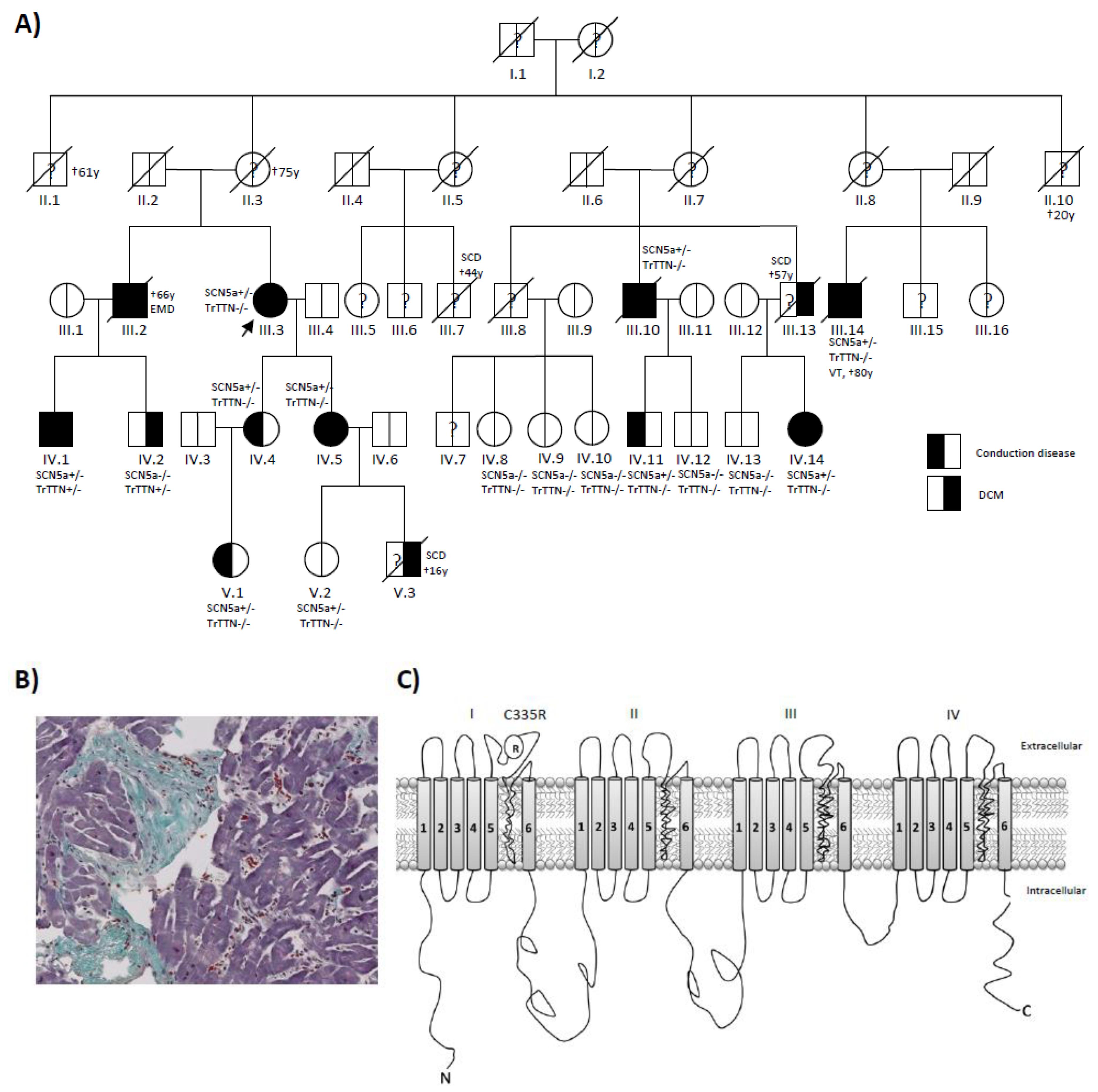Figure 1. Identifying SCN5a p.C335R and TTN truncating variants by using precision diagnostic methods. (A) Patient’s pedigree showing co-segregation of an SCN5a C335R variant. The index patient (III. 3) was diagnosed with DCM and sick sinus syndrome at age 59 and underwent CRT-D implantation. She only carried the SCN5a C335R variant. Patient IV.1 was diagnosed with DCM and conduction disease at age 24. He carried both SCN5a and TTN truncating variants. (B) Masson Trichrome stained left ventricular endomyocardial biopsy of patient IV.1 with SCN5a and TTN truncating variants. Histopathological examination demonstrated extensive cardiac fibrosis in this patient with DCM and conduction disease. (C) Schematic representation of the Nav1.5 cardiac sodium channel. The variant is located in Ploop between S5 and S6 of Domain-I.