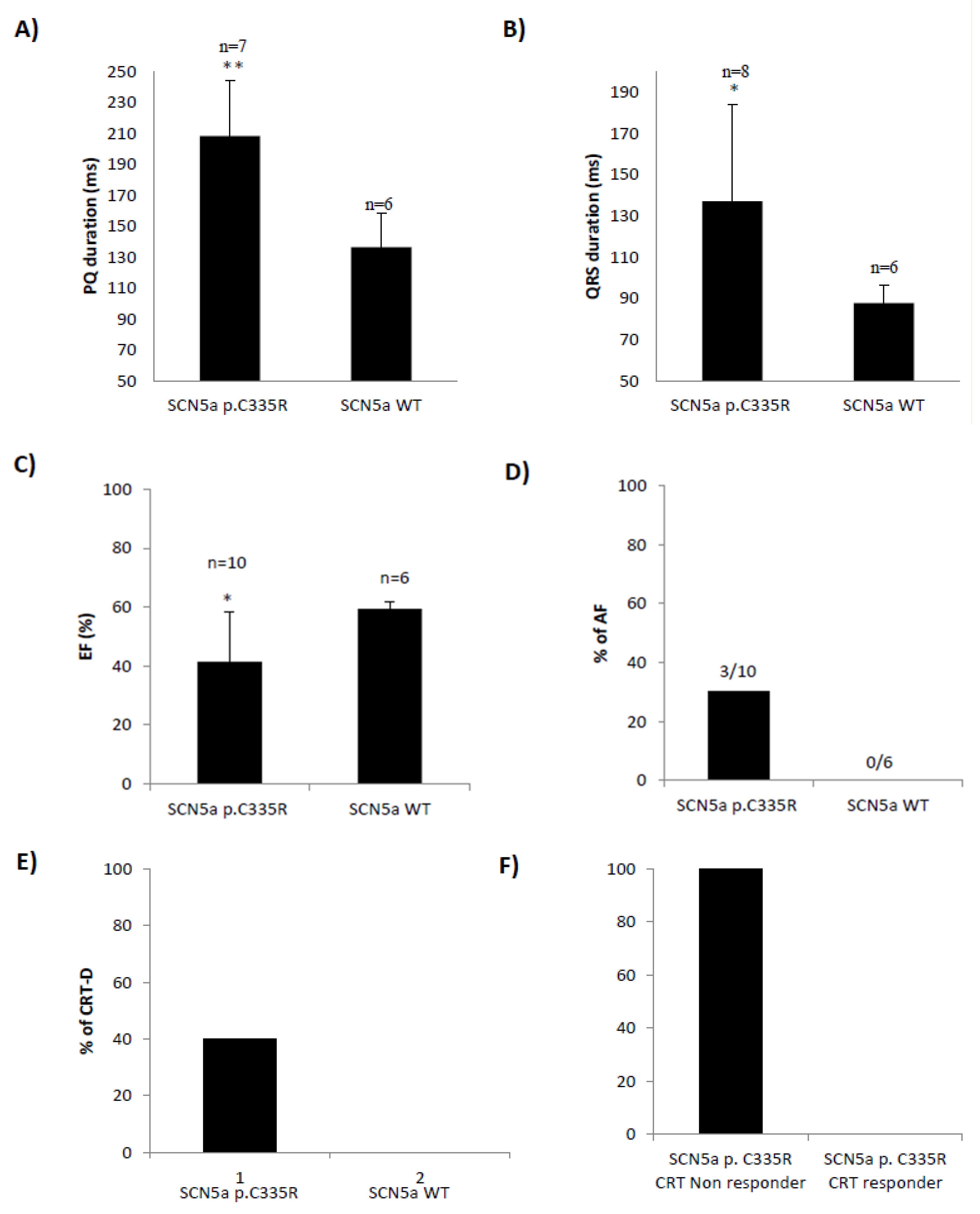 Figure 2. SCN5a p.C335R carriers show conduction disease and reduced left ventricular ejection fraction (LV-EF). All family members with SCN5a p.C335R variant showed significantly longer PQ (A) and QRS intervals (B), lower left ventricular EF (C), and higher atrial fibrillation (AF) rates (D) than other family members without this variant. All 4 family members carrying SCN5a p.C335R who received CRT-D were non-responders (E,F). T-Test; * = p ≤ 0.05, ** = p ≤ 0.01. Data are presented as mean ± SD.