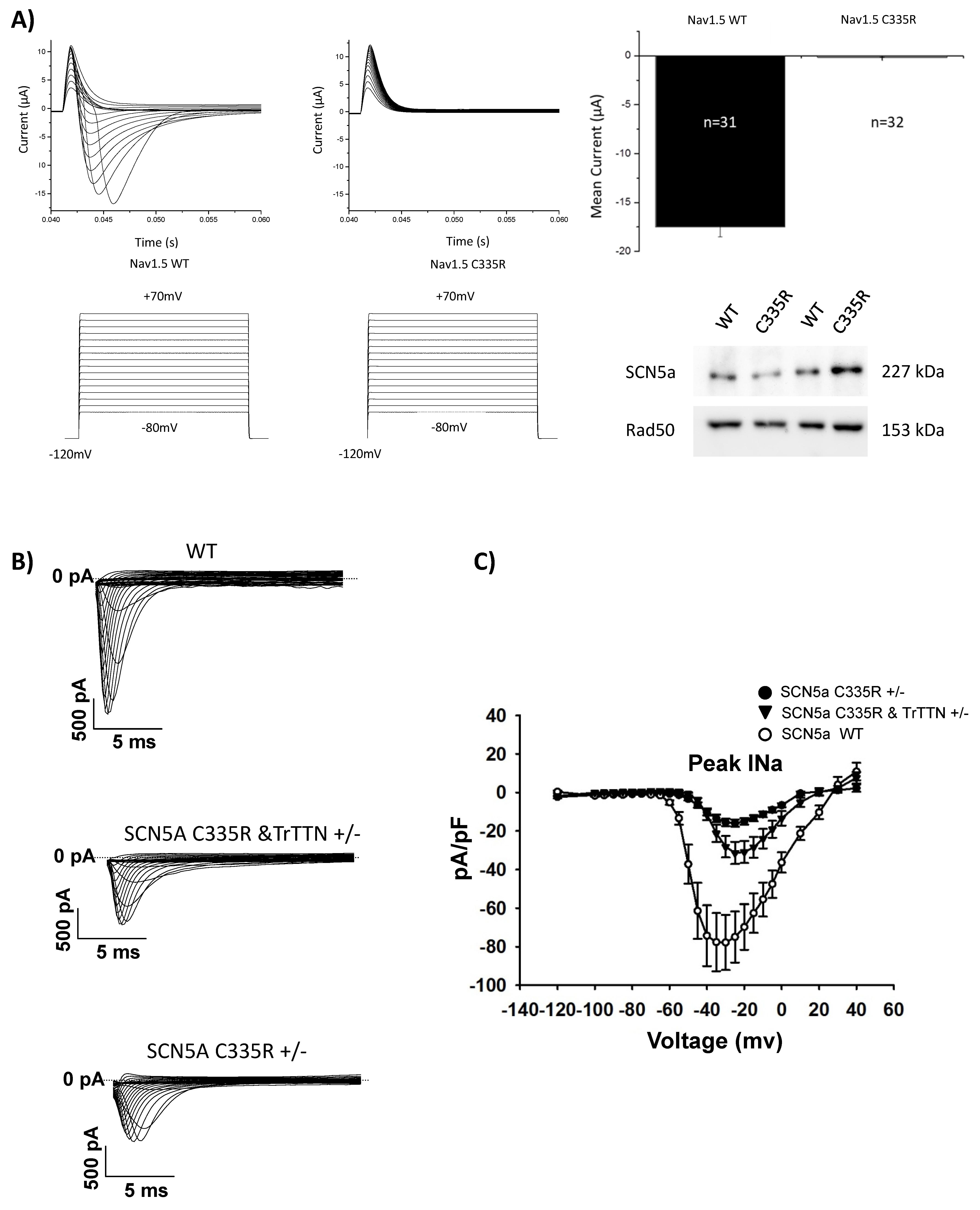 Figure 3. Functional analysis of SCN5a p.C335R variant. (A) Na+ current traces from Nav1.5 wild-type and p.C335R transfected Xenopus oocytes. This showed a loss of function in Nav1.5 p. C335R. Sodium channel currents (INa) were evoked from −80 mV to 70 mV. Western blot analysis confirmed that the wild-type and mutated Nav1.5 were expressed and that loss of Nav1.5 function was not due to absent expression of the protein. Anti-Rad50 used as a reference. (B,C) Representative traces of INa in iPSC-CMs with wild-type and SCN5a p.C335R variant. Sodium channel currents (n = 9) were reduced in iPSC-CMs of the DCM patients.