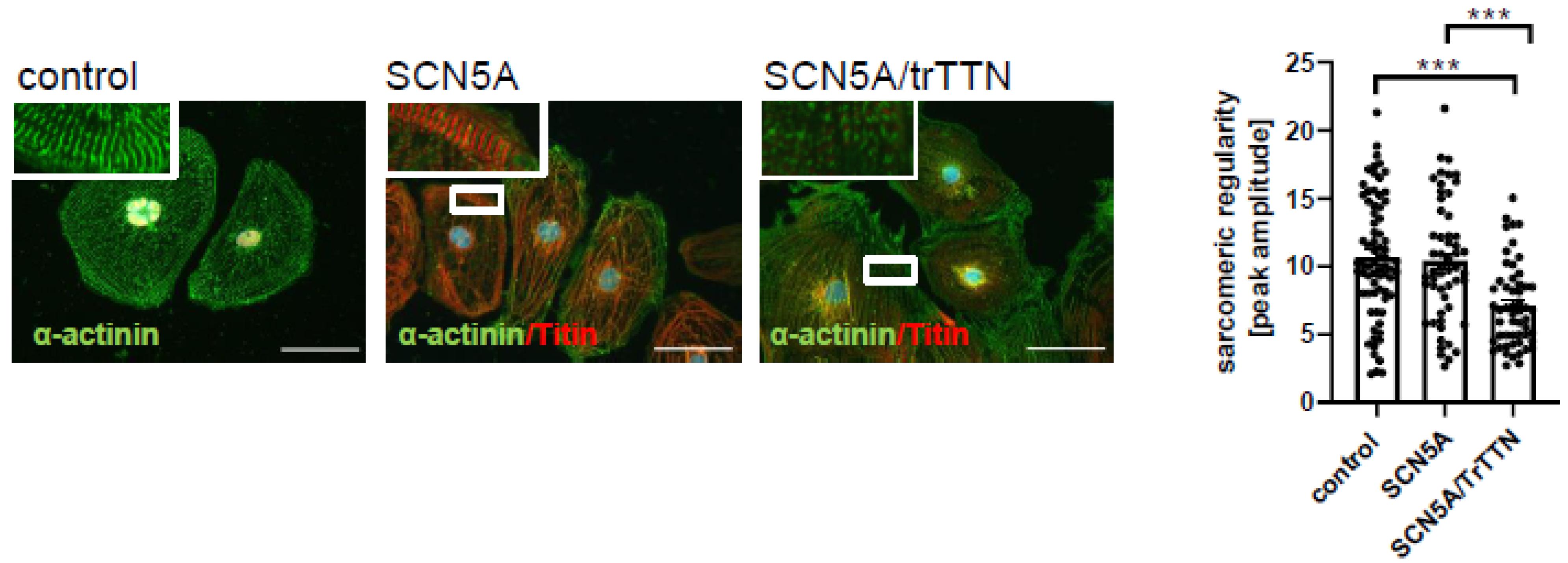 Figure 4. Disturbed sarcomeric z-disc regularity in iPSC-CMs with TTNtv. Sarcomeric structure is visualized by immunofluorescence staining against α-actinin (green) and TitinM8/M9 (red). Scale bar = 50 μm. Using fast Fourier transformation (FFT), the sarcomeric pattern regularity of the α-actinin channel was analyzed. Four cardiac differentiations for control (n = 72) and 3 cardiac differentiations for each patient-specific iPSC line (each n = 54) were analyzed. Data are presented as mean ± SEM. p < 0.001 by one-way ANOVA with Tukey’s correction. *** = p ≤ 0.001.