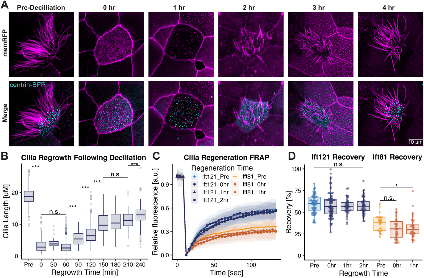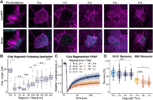 FIGURE 3: Induced cilia regeneration has no effect on IFT protein dynamics at the basal body. (A) Time course tracking cilia regrowth, predeciliation, postdeciliation and every hour up to the fourth hour timepoint. (B) Quantification of ciliary length prior to and during ciliary regeneration. (C) FRAP recovery curves of Ift121-GFP and Ift81-GFP at different timepoints pre-, post-, and during ciliary regeneration. (D) Mobile fraction values of Ift121-GFP and Ift81-GFP pre-, post-, and during ciliary regeneration. |