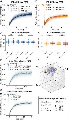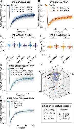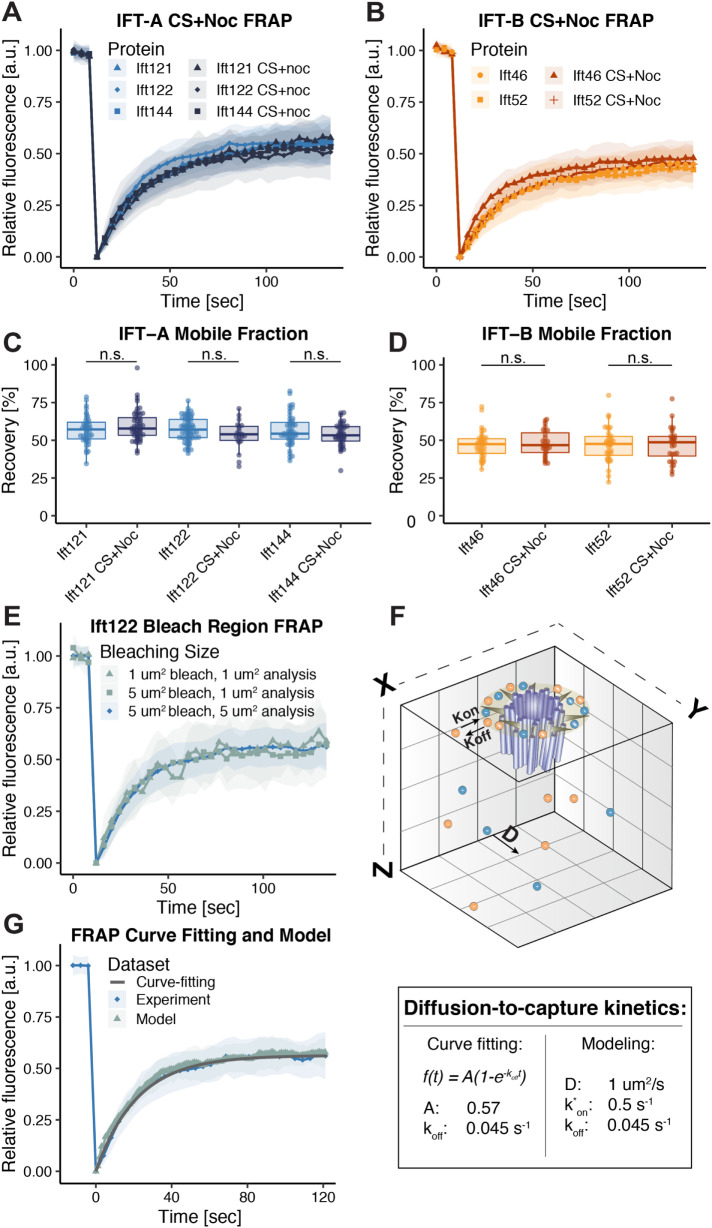 FIGURE 5: Cytosolic MTs are dispensable for IFT recruitment to basal bodies. (A) FRAP recovery curves of IFT-A proteins with and without CS+Noc treatment. (B) FRAP recovery curves of IFT-B proteins with and without CS+Noc treatment. (C) Mobile fraction comparison of basal body turnover kinetics of IFT-A proteins between no treatment and CS+Noc treatment. (D) Mobile fraction comparison of basal body turnover kinetics of IFT-B proteins between no treatment and CS+Noc treatment. (E) FRAP recovery curves of GFP-Ift122 with 5 and 1 µm2 bleaching regions. (F) Schematic representation of diffusion-to-capture, with modeling parameters depicted. The table displays the equation used and parameters obtained. (G) Experimental and model FRAP recovery curves of GFP-Ift122, with the curve-fitting equation line overlaid. |