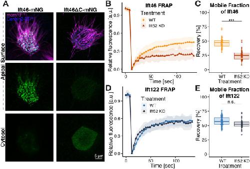 FIGURE 2: Ift52 is required for the recruitment and normal turnover of Ift46 at basal bodies. (A) Imaging of Ift46-mNG (left panel) and Ift46ΔC-mNG (right panel). (B) FRAP of Ift46-mNG in WT embryos compared with ift52 KD. (C) The mobile fraction value of Ift46-mNG is significantly lower on KD of Ift52. (D) FRAP recovery of GFP-Ift122, an IFT-A protein, is not affected by ift52 KD. (E) Mobile fraction quantification of GFP-Ift122 in WT and ift52 KD embryos. |