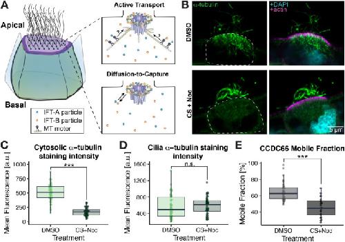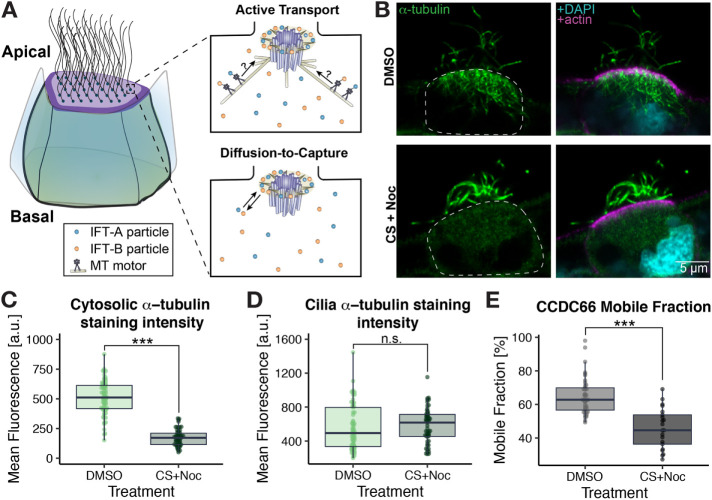 FIGURE 4: Cold-shock + nocodazole (CS + Noc) treatment eliminates cytosolic MTs and disrupts the dynamics of Ccdc66 at basal bodies. (A) Schematic representation of MCC depicting the two proposed mechanisms for IFT recruitment to basal bodies: active transport (top panel) and diffusion-to-capture (bottom panel). (B) Transverse sections of Xenopus MCCs stained for a-tubulin to verify efficacy of treatment. Actin (stained by Alexa Fluor 555 Phalloidin) and DAPI show the apical domain and nuclei, respectively. DMSO (mock)-treated cells are shown in the top panels and CS+Noc-treated cells in the bottom panels. (C) Cytosolic a-tubulin staining quantification for DMSO vs. CS+Noc-treated embryos. (D) Ciliary a-tubulin staining quantification for DMSO vs. CS+Noc-treated embryos. (E) Mobile fraction comparison of basal body turnover kinetics of Ccdc66 between DMSO and CS+Noc treatment. |
