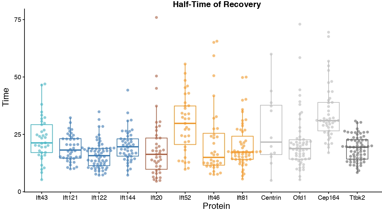 Supplemental Figure 1. Half-times of basal body proteins are generally short. IFT and other basal body proteins generally display half-times less than 25 seconds. |