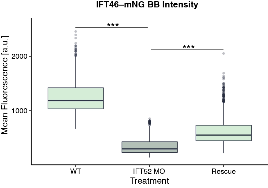 Supplemental Figure 2. Morpholino-based KD of ift52 is rescued by addition of Ift52. Basal body intensity of Ift46-mNG was measured in WT conditions and upon ift52 KD and ift52 KD + rescue. |