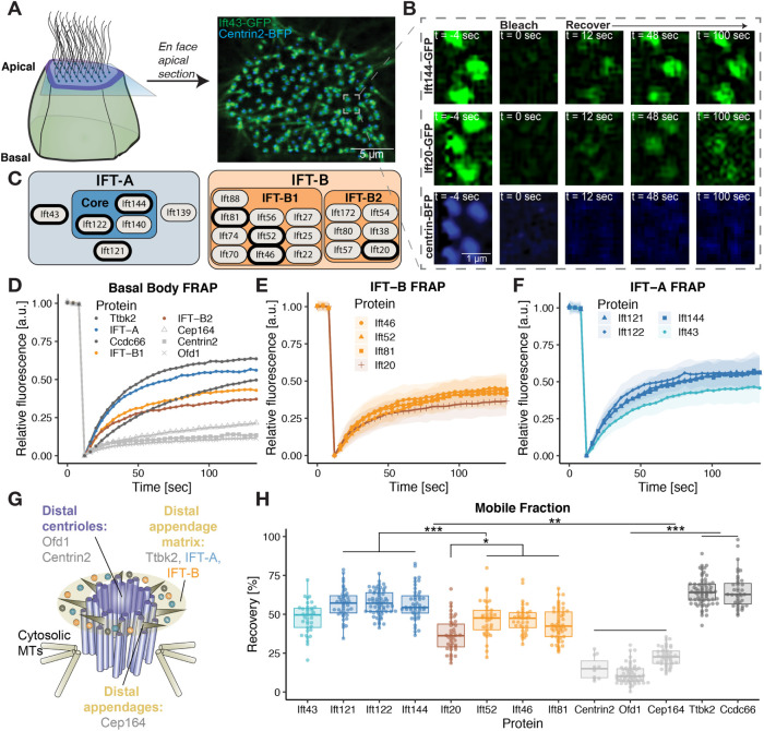 FIGURE 1: Functionally related proteins show distinct turnover kinetics in the basal body pool. (A) Schematic representation of FRAP experimental setup. IFT43-GFP accumulates around Centrin2-BFP, a marker for basal bodies. (B) Representative images from FRAP experiments of Ift144-GFP, Ift20-GFP, and Centrin2-BFP. (C) Schematic of IFT-A and IFT-B complexes. Proteins investigated in this report are bolded. (D) FRAP recovery curves of IFT-A proteins (averaged from Ift144-GFP, GFP-Ift122, and Ift121-GFP), IFT-B1 proteins (averaged from Ift81-GFP, Ift52-mNG, and Ift46-mNG), IFT-B2 protein Ift20-GFP, structural basal body components (Cep164-GFP, Centrin2-BFP, GFP-Ofd1), and basal body regulators (GFP-Ttbk2, GFP-Ccdc66). For clarity of presentation, error bars are removed. (E) FRAP recovery curves of IFT-B proteins. Shaded area corresponds to SD. (F) FRAP recovery curves of IFT-A proteins. Shaded area corresponds to SD. (G) Schematic representation of a basal body, showing the localization of different proteins. (H) Mobile fraction quantification of basal body turnover kinetics for investigated proteins. Several statistical differences are noted in the tree; for full discussion of differences, see Supplemental Table S2. |