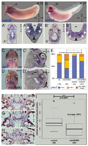 (A, B) Later expression of zbtb26 mRNA in thyroid tissues of st. 42 (A) and st. 45 (B) Xenopus tadpoles. Expression can still be found in the split lateralthyroid (A-B, black arrowheads). Planes of section in A and B are indicated by dashed lines in A and B, respectively; magnified area in A and B is indicated by dashed boxes in A and B, respectively; thyroid anlage highlighted by doted circles in A and B. (B-D) Other thyroid markers are not influenced by zbtb26 knockdown. Knockdown of zbtb26 has no significant impact on the expression of foxD3, hhex or nkx2.1 in the thyroid anlage (C). Mid-sagittal sections illustrating overlap of expression of pax2 (D) and zbtb26 (E) mRNA in the thyroid anlage of st. 37.