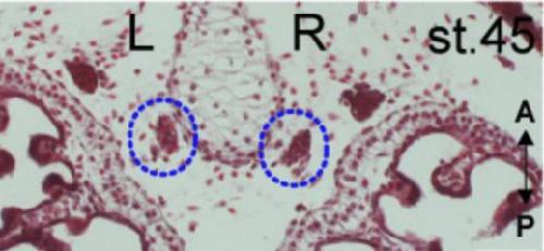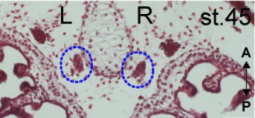 Histological section through pharyngeal region of a X. laevis embryo at NF stage 45, showing normal appearance of left (L) and right (R) thyroid gland primoridum, circled in blue.