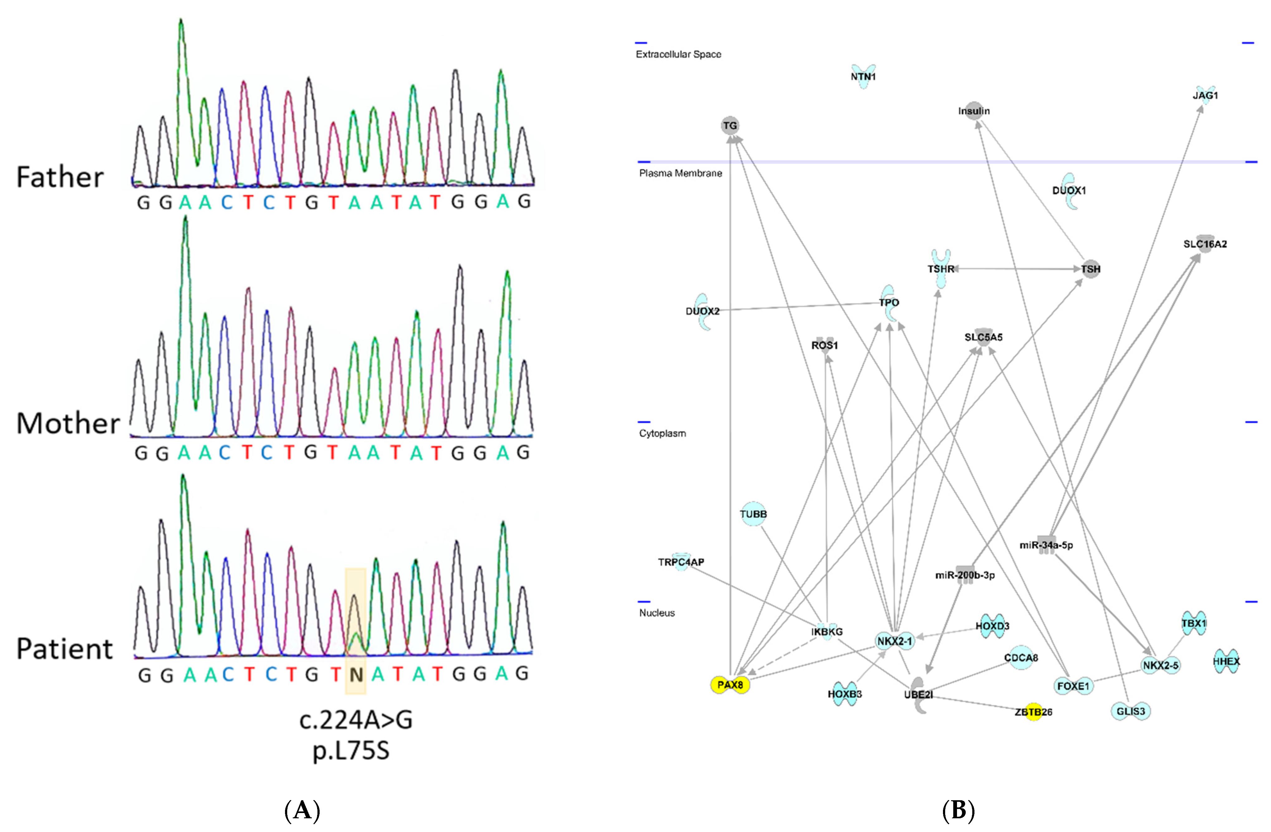 Figure 1. Identified variants in the ZBTB26 gene and IPA Network analysis with known CH genes. (A) Sequence of trio with unaffected parents and affected child. Sanger sequencing in index case demonstrates a de novo variant c.224A>G in the ZBTB26 gene which was not present in the unaffected parents. (B) Ingenuity (IPA) Network analysis. Known genes from the literature (in blue color) underlying congenital primary hypothyroidism were analyzed using the IPA network analysis. The newly identified ZBTB26 gene was added to predict functional connections in the context of known protein networks. ZBTB26 and PAX8, both located in the nucleus, are highlighted in yellow. They are connected via NKX2-1 and UBEI. BOREALIN is also called CDCA8.