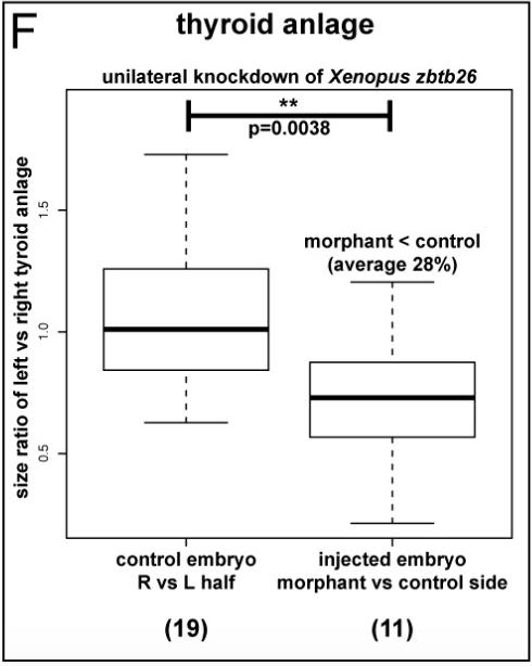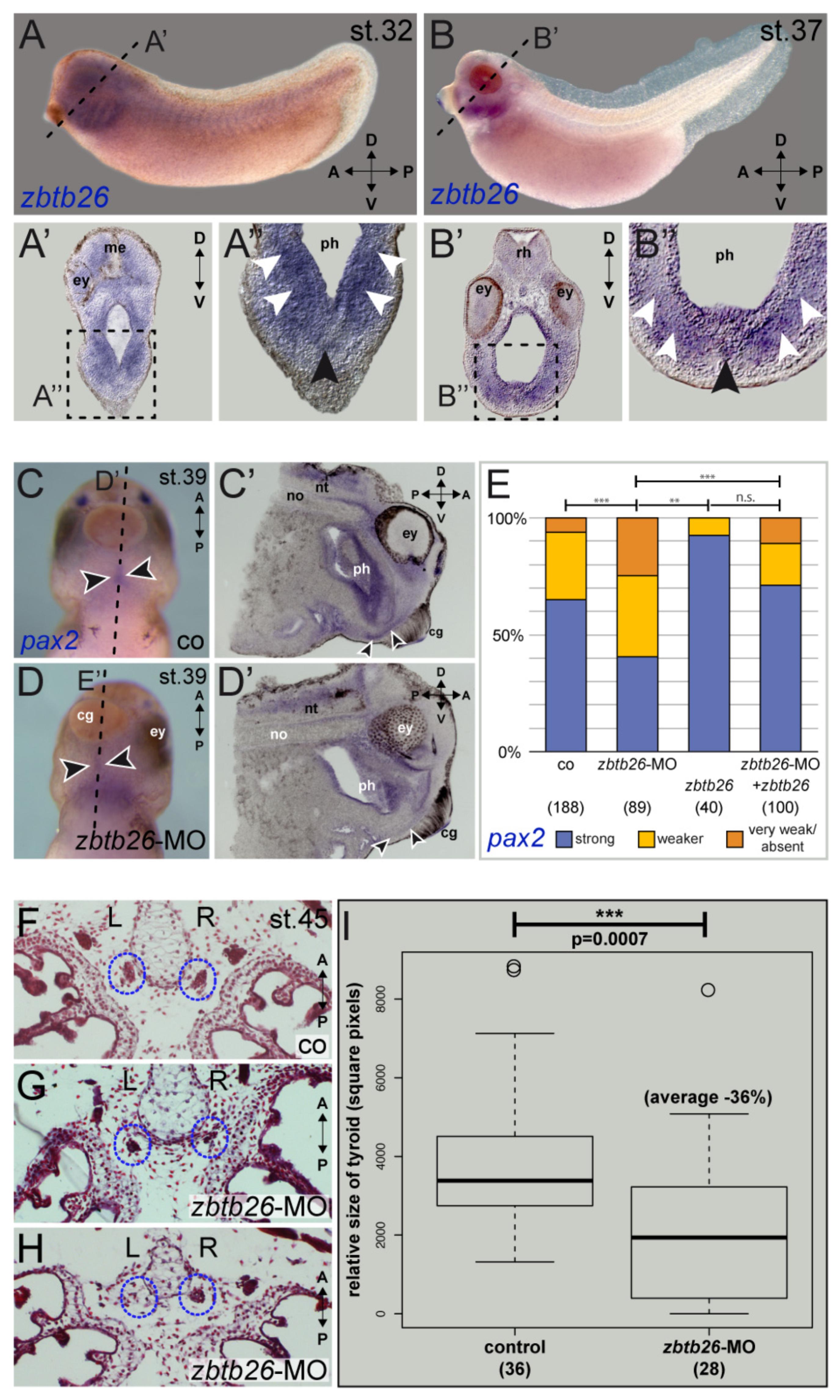 (F) Unilateral loss of zbtb26 negatively affects development of the thyroid anlage in the morphant half of the embryos. Dot plot of size ratios of the two thyroid anlagen of one embryo. Quantification shows significantly reduced size of morphant versus control side in unilaterally injected embryos (right) but not right versus left sides in control embryos (left). A, anterior; cg, cement gland; co, control; d, dorsal; ey, eye; n.s., not significant; ph, pharynx; P, posterior; Rh, rhombencephalon; st., stage; V, ventral. Sample numbers indicated in brackets (number of embryos in C and F). *p<0.05, **p<0.01, ***p<0.001