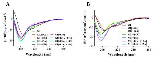 Figure 3. Circular dichroism spectra of α-conotoxins and their variants in 0.01 M PBS (pH = 7.2). (A) GI mutants. (B) MI mutants. n = 3.