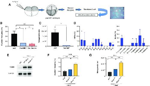 Figure 1. Pre-MBT Xenopus embryos accumulate polymorphisms and deletions. (A) Drawing of the experimental strategy adopted to analyze mutagenesis in X. laevis embryos. Two-cell-stage embryos are injected with a supercoiled plasmid containing lacZ reporter gene (pEL1) and allowed to replicate for further three divisions. After embryo collection, plasmid DNA is extracted and transformed in lacZ-deficient bacteria for white/blue screening. (B) Mutation frequency expressed as a percentage of white colonies in each condition. The mutation frequency of lacZ recovered from embryos injected with a post-MBT amount of plasmid DNA is also included as comparison. Pre-MBT and post-MBT, n = 3; pre-injection, n = 2. (C) Mutagenesis rate in the indicated different experimental conditions expressed as mutations per base pair/locus per generation (see the ‘Materials and Methods’ section), normalized to the pre-injection background values (n = 3). (D) Mutation spectra of the lacZ gene recovered from Xenopus pre-MBT embryos after Sanger sequencing (n = 3). (E) Western blot of total protein extracts obtained from Xenopus embryos subjected to the indicated experimental conditions (n = 2). (F) Mutation frequency and (G) mutagenesis rate of lacZ isolated from Xenopus embryos injected as indicated. lacZ, n = 3; Mlh1, n = 2. Data are presented as means ± SD. Means were compared using unpaired Student’s t-test. |