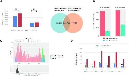 Figure 5. Chromosome-specific variation in SNVs in the absence of maternal dPolη (A, left panel) SNVs and indel abundance in WGS sequenced adult flies either maternally depleted or maternally provided of dPolη. Right panel: diagram displaying how many counted SNVs on the indicated fly genomes are mutual or distinct. The graph represents the average of two sequenced flies per condition. Data are presented as means ± SD. No statistical significant difference was detected for either SNVs or indels (unpaired Student’s t-test). (B) Chromosome 3L (left panel) and 3R (right panel) SNV rates of maternally provided (red bars) or maternally depleted (green bars) dpolη male adult flies. SNV means of two independent WGS analyses are expressed as counts in the columns. Data are presented as means ± SD. Means were compared using unpaired Student’s t-test (n = 2). (C) SNV graphic representation (mutation count) in the pericentromeric region of either the left portion (3L) or right portion (3R) of chromosome 3. SNVs found only in either maternally depleted or maternally provided dPolη progeny are shown, respectively, in orange or green, while common SNVs are illustrated in blue. Lower panel: graphic representation of gene density (gene count) along the indicated chromosome regions (n = 2). (D) Mutation spectrum on chromosome 3, where x-axis indicates types of nucleotide variants and y-axis indicates the quantity of counted SNVs. Unique polymorphism in either maternally depleted or partially maternally provided dPolη progeny is separately represented in blue or in red, while mutual variants are displayed in green. Means were compared using unpaired Student’s t-test (n = 2). |