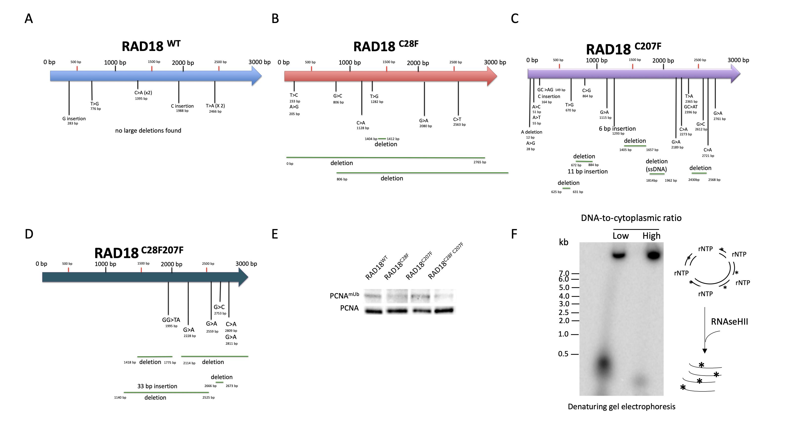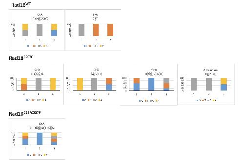 Supplementary Figure S3. Mutations map of lacZ co-injected with RAD18 mRNAs (A-D) Mutations map of the lacZ gene recovered from pre-MBT embryos co-injected with the indicated Rad18 forms (n=3). (E) Western blot of 16-cell Xenopus embryos protein extracts with either a PCNAmUb- or a PCNA-specific antibody expressing the indicated Rad18 variants. (F) High level of ribonucleotides incorporation during DNA synthesis at low DNA-tocytoplasmic ratio. Autoradiograph of radioactive-labeled M13 ssDNA replicated in egg extracts at different doses: low (0.66 ng/µL-1) for pre-MBT-like or high DNA-to-cytoplasmic ratio (6.6 ng/ µL-1) for post-MBT-like dose, treated with NaOH and separated by denaturing urea-gel electrophoresis. Products were compared with DNA ladder of know size (n=2). |