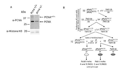 Supplementary Figure S5. PCNA detection in Drosophila and genetic crosses used to generate maternally-depleted dpolη flies (A) Western blot of total protein extracts obtained from flies of the indicated genotype with the PC10 antibody (n=2). (B) Genetic crosses set up to generate either maternally-depleted or maternally-provided dPolη adult flies. The first two crosses generated a balanced stock over TM3 marked with Sb with a isogenic 3rd chromosome carrying the dpolηExc2.15 mutation. From this stock, one homozygous (left) and one hetreozygous (right) virgin females were collected and mated with the same wild type male, to produce embryos which were respectively depleted or not of maternal deposited dPolη. Then, genotypically identical adult males, devoid of the Sb marker, and containing the isogenic 3rd chromosome carrying the dpolηExc2.15mutation, were collected for WGS processing and analysis. |