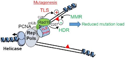 Graphical Abstract. Speculative model of early Xenopus embryo replisome. High Rad18 abundance induces both constitutive PCNA monoubiquitination (PCNAmUb) and active translesion DNA synthesis (TLS) generating mutations (red triangles) at high rate (+ sign). Both Rad18 homology-directed repair activity (HDR) and the mismatch repair system (MMR) function synergistically with TLS to reduce the mutation load (− sign). The Rad18 residues important for TLS activity (C28) and HDR activity (C207) are also indicated. |