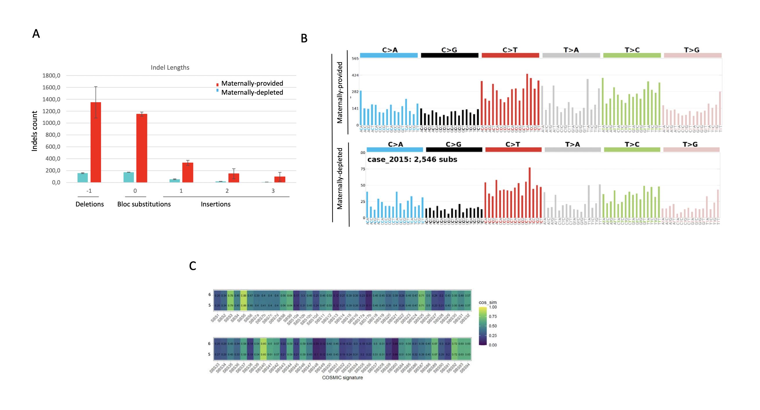 Supplementary Figure S7. Analysis of dPolη mutation signatures on the pericentromeric region of Drosophila chromosome 3. (A) Statistical analysis of Indels length on the pericentromeric region of chromosome 3. The sizes refer to whether the variant is an insertion (positive numbers), deletion (negative numbers), or a block substitution (0). (B) Average of number of single base substitutions in all possible trinucleotide contexts on the pericentromeric region of chromosome 3 in either dpolη maternally-provided or maternallydepleted flies. (C) Heatmap showing the normalized relative contribution of dPolη mutational signatures from human tumors. |