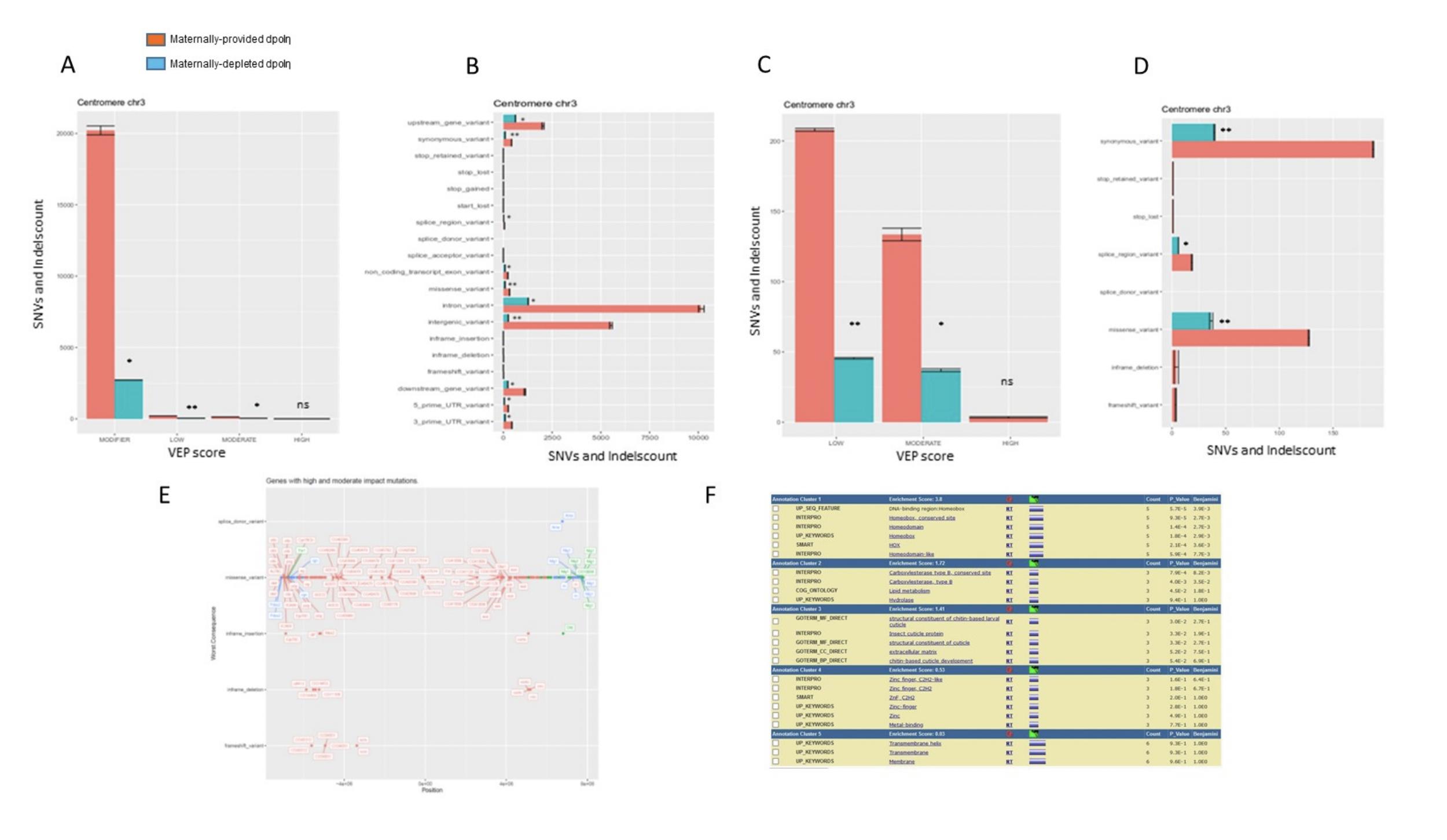 Supplementary Figure S8. Impact of dPolη maternal depletion on gene function (A) Diagram classifying the impact of mutations found on chromosome 3L (left panel) and chromosome 3R (right panel). Mutations are classified according to their effect by attribution of a VEP score. These panels describe how many SNVs (y-axis) have high, low, moderate or modifier effect (x-axis) in each sequenced fly. Most mutations generated in maternallyprovided dPolη flies do not particularly affect genes, transcripts, protein sequence, or regulatory regions (n=2). (B) In this plot, types of variants with modifier VEP score are listed on the y-axis and the counts for the type of polymorphisms are shown on the x-axis. Most of mutations are slightly altering introns or intergenic regions (n=2). (C) In this panel, modifier VEP scores have been discarded to focus on the consequences of other scored variants. Most polymorphisms have a moderate effect on altered gene (n=2). (D) Evaluation of mutation impact upon discarding variants with modifier score. In this graph, types of variants with other scored are illustrated on the y-axis and the counts for each type of polymorphisms are shown on the x-axis. Most of SNVs give raise to missense variants(n=2). Data are presented as means ± SD. Means were compared with an unpaired Student’s t test. (E) Graphic representation of SNVs consequences on genes found on the pericentromeric region of chromosome 3 in either dPolη maternally-provided (red) or maternally-depleted (green) flies. Common genes are indicated in blue. (F) Gene ontology analysis of genes found on the pericentromeric region of chromosome 3. |